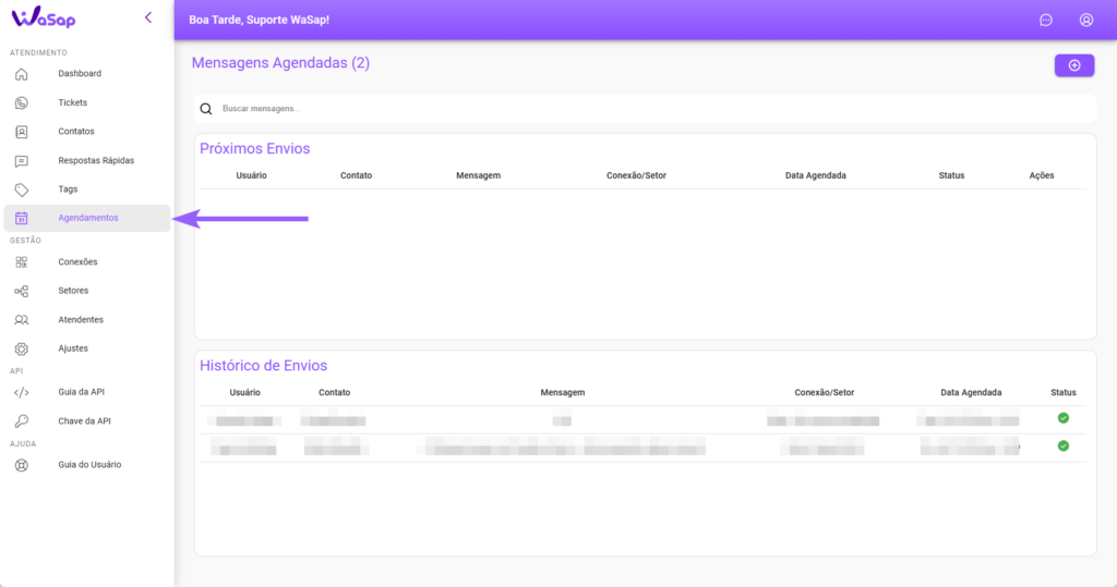- Para visualizar os próximos envios e o histórico de mensagens agendadas, acesse o menu lateral e clique em “Agendamentos”. Lá, você terá todas as informações organizadas em um único lugar.