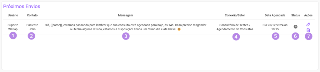 - Status do envio, responsável por mostrar se a mensagens está agendada, enviada ou cancelada;