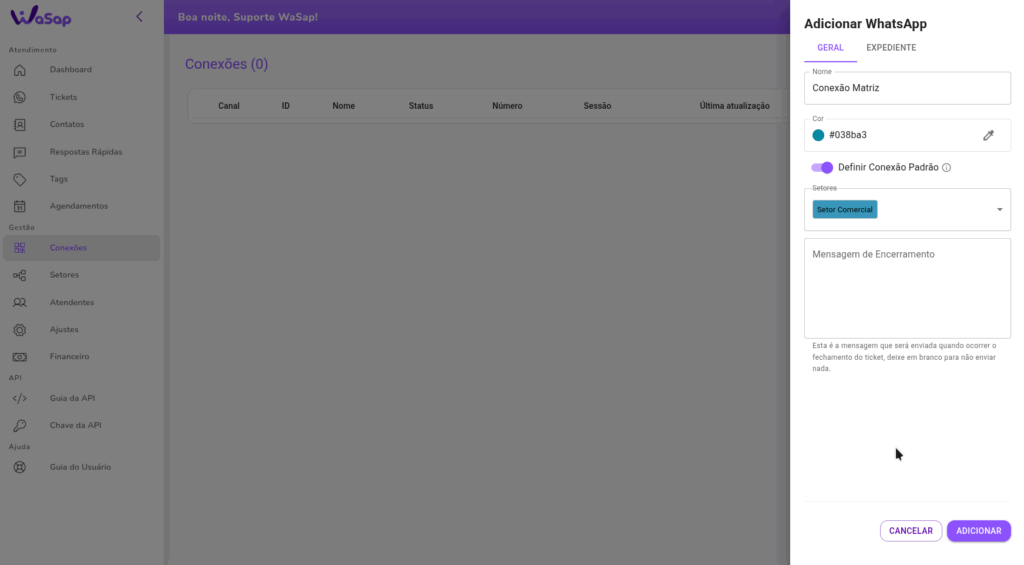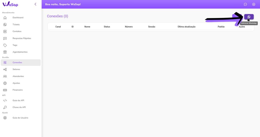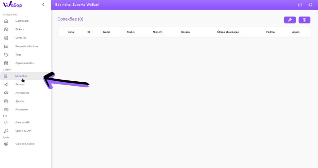 - Vamos começar acessando a opção “Conexões”, no menu lateral do WaSap: