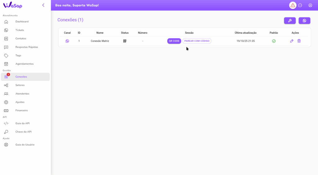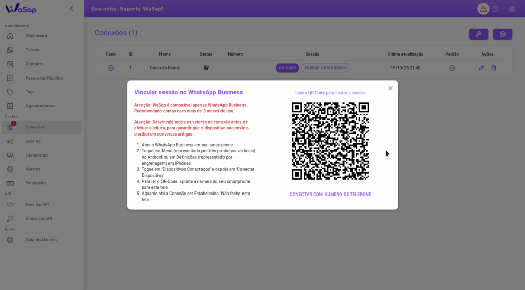 Na primeira conexão com o WaSap, recomendamos que efetue a conexão com a plataforma antes de vincular setores na conexão. Isso evita conflitos com conversas antigas, arquivadas e não lidas. Caso haja setores vinculados, isso pode levar ao envio do chatbot em massa para todas essas conversas.