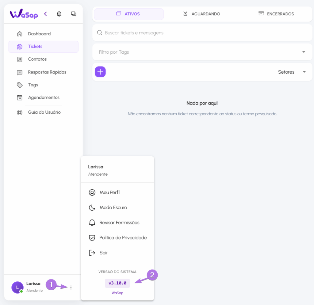 • Clique no ícone de avatar, localizado no canto inferior esquerdo da tela da plataforma WaSap. Isso abrirá o menu do usuário, e no final do menu será exibida a versão atual do sistema.