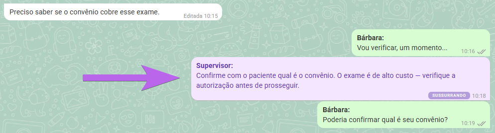 Agora é possível enviar notas internas, invisíveis ao cliente, utilizando o prefixo >>>. Esses “sussurros” são exibidos de forma diferenciada na interface, com uma etiqueta exclusiva, e servem para dois principais usos: